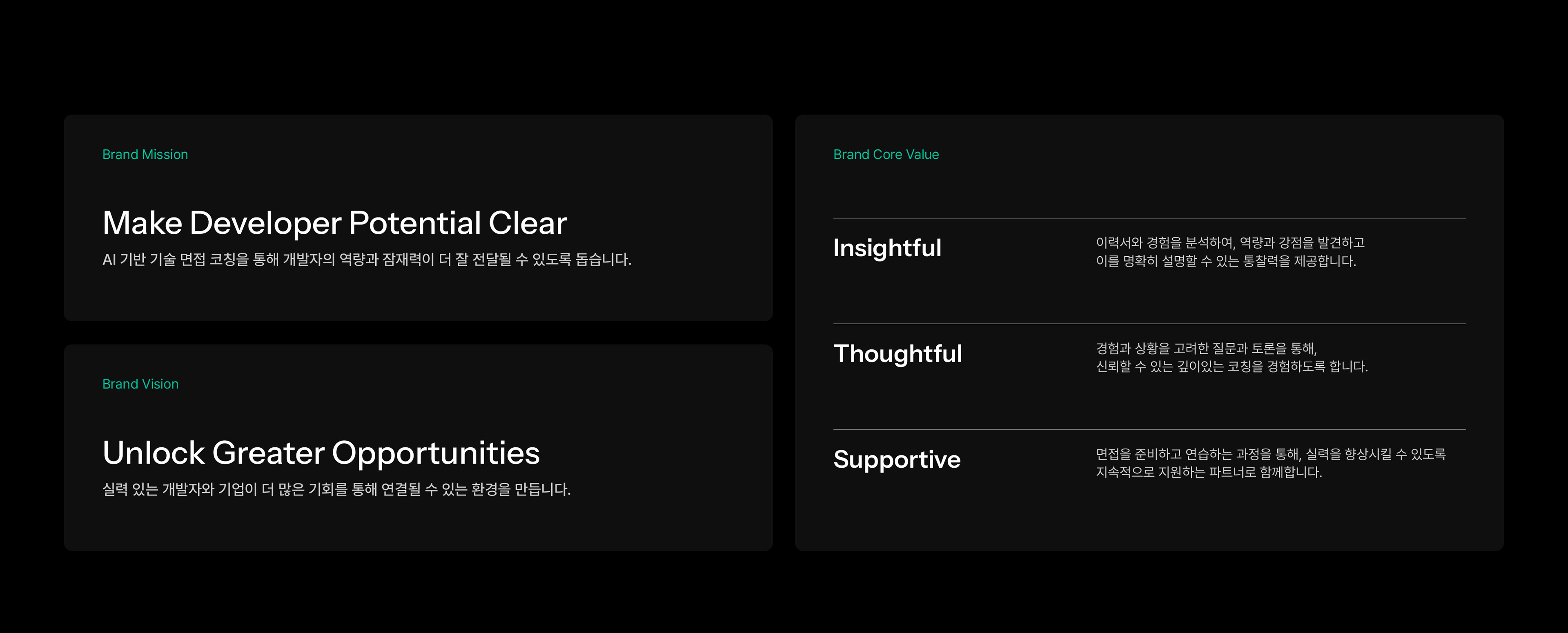 브랜드 전략은 기술면접 코칭 서비스가 쉽게 평가와 압박의 인상으로 받아들여질 수 있다는 점을 고려해, Deep Quest를 사용자를 판단하는 도구가 아닌 강점을 발견하고 방향을 제시하는 파트너로 정의하는 데서 출발했습니다. 이를 바탕으로 Insightful, Thoughtful, Supportive라는 핵심 가치를 도출하고, 서비스가 전달해야 할 태도와 인상을 정리했습니다.